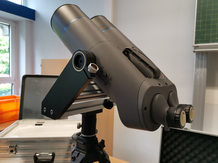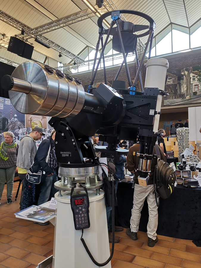 Anschließend ging es aber sofort weiter zu den Herstellern. Im Eingangsbereich war traditionell auch Berlebach (https://www.berlebach.de) als Aussteller zu finden, die im letzten Jahr gerade ihr 120jähriges Bestehen gefeiert hatten. Neu wurde dieses Jahr eine Weiterentwicklung des bekannten Planet-Stativs gezeigt, welches eine Kurbelmittelsäule enthielt, wodurch man verschiedene Höhen einstellen kann. Die Konstruktion machte einen sehr soliden Eindruck und soll noch 60 kg tragen können. Sie soll verhindern, dass bei längeren Teleskopen wie beispielsweise Refraktoren ein Anschlagen an die Stativbeine erfolgen kann. Die Entwicklung ist aber noch nicht ganz abgeschlossen, da noch an weiteren Details gefeilt wird. Bestehende Planet-Stative sollen nachgerüstet werden können.