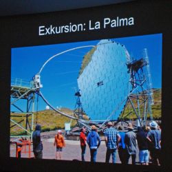 Danach ging es zum Kernthema der BoHeTa über, indem Prof. Dr. Dominik Elsässer von der Universität Dortmund/Würzburg über Multiwellenlängen-Beobachtungen von aktiven Galaxienkernen berichtete. Er dozierte, dass aktive Galaxienkerne schon in der Frühgeschichte der Astronomie beobachtet wurden. 1943 veröffentlichte Carl K. Seyfert eine Liste naher Galaxien mit ungewöhnlichen Emissionslinien, die heute als Seyfert-Galaxien bekannt sind. Maarten Schmidt erkennt 1963 diese Linien als Balmer-Serie des Wasserstoffs, bei einer extrem hohen Rotverschiebung. Bei einem Galaxienkern muss es sich daher um ein Objekt handeln, das sehr weit entfernt ist und eine enorme Leuchtkraft besitzt. Es wurde damit herausgefunden, dass es sich bei diesen Galaxienkernen um Schwarze Löcher handelt, die im Zentrum betreffender Galaxien für die Energiefreisetzung verantwortlich sind. Damit spielen aktive Galaxienkerne in der Astronomie eine wichtige Rolle als Beobachtungswerkzeuge, etwa zum Nachweis intergalaktischen Wasserstoffs durch Absorptionslinien, als ferne Lichtquelle bei Gravitationslinsen oder als so gut wie unveränderliche Bezugspunkte für Astrometrie oder Geodäsie. Trotzdem sind noch lange nicht alle Fragen beantwortet. Unter anderem wird daher auf La Palma mittels der HEGRA-Teleskope (High Energy Gamma Ray Astronomy) weiter geforscht, um rotverschobene Gammaquellen zu finden.