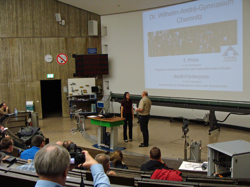 Die traditionelle Verleihung des Reiff-Preises für Amateur-/Schularbeit wurde wieder sehr professionell von Dr. Carolin Liefke durchgeführt. Ausgezeichnet wurden das Dr. Wilhelm Andre Gymnasium in Chemnitz (dritter Preis), die Sternwarte Siebengebirge (zweiter Preis) sowie die Leonore-Goldschmidt-Schule in Hannover (erster Preis).