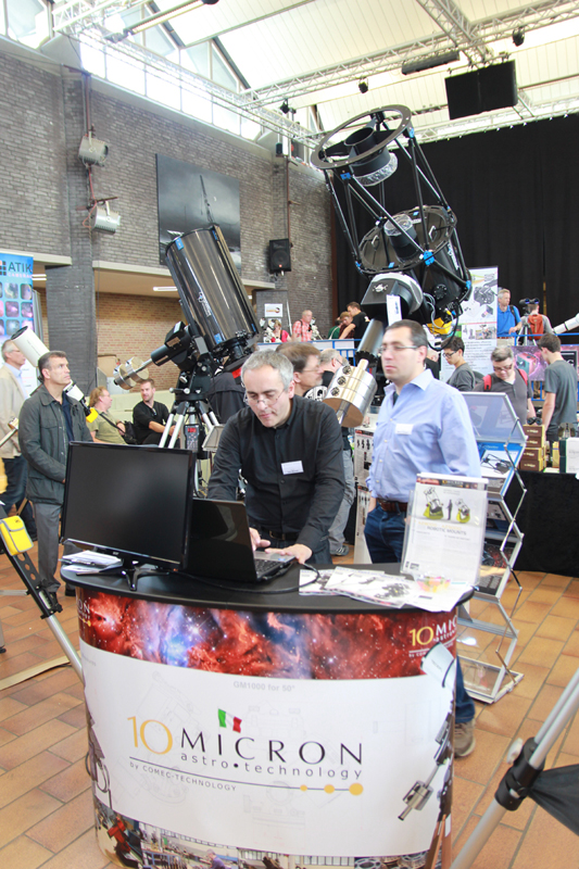 An dem Stand von 10Micron (http://www.10micron.de) konnte man High-Tech-Montierungen "Made in Germany" begutachten. Dabei machten auch die aufgesattelten Teleskope (u.a. ein TEC-Refraktor mit 980 mm Brennweite) eine gute Figur. Zum Einsatz kam beim TEC APO140ED dabei auch der bekannte Feather-Touch-Auszug, der eine ganz genaue Fokussierung ermöglicht. Die Leichtgängigkeit bei der Fokussierung machte eine außerordentlich guten Eindruck. Die Montierungen selbst ermöglichen mittels Absolut-Encodern in beiden Achsen eine Nachführgenauigkeit von unter einer Bogensekunde. Dadurch ist kein Autoguiding mehr notwendig.
