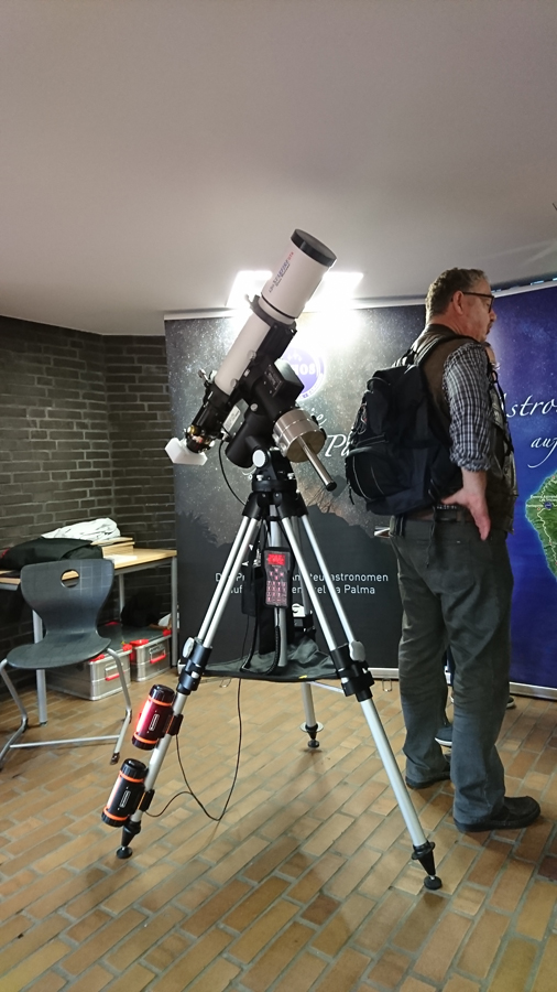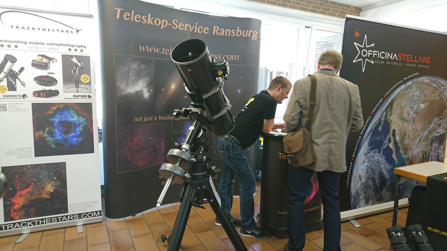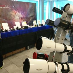 Die große Messehalle bot auch in diesem Jahr wieder die Hauptstände von Baader, Celestron (http://www.baader-planetarium.de) & Co. an, die auch zuerst besucht wurden. Meade, als zweiter großer amerikanischer Teleskop-Hersteller, war dabei leider wieder nicht aufzufinden. Als Neuheiten wurden Astrographen und HyperStar-Aufsätze gezeigt, was klar die Astrofotographen ansprechen sollte. Die gute Qualität der Kollimation von Baader hat sich dabei inzwischen auch bei Celestron USA herumgesprochen, weshalb die Geräte vorab zur Neujustierung inzwischen nach Deutschland geschickt werden. Eine Verbesserung für das Scharfstellen den HyperStar-Korrektor kann durch den Austausch des Justierknopfs an der Schmidt-Platte mittels feinerer Untersetzung (1:10) erfolgen, wie am Stand zu erfahren war.