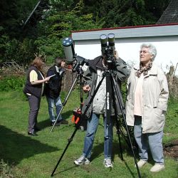 Bei strahlendem Sonnenschein standen ab 7.15 Uhr ein 8"-Teleskop, ein Binocular 15x60 und eine Fernglas-Sonnenprojektion im Garten, und wir konnten den Merkur ganz am linken Rand der Sonne begrüßen.