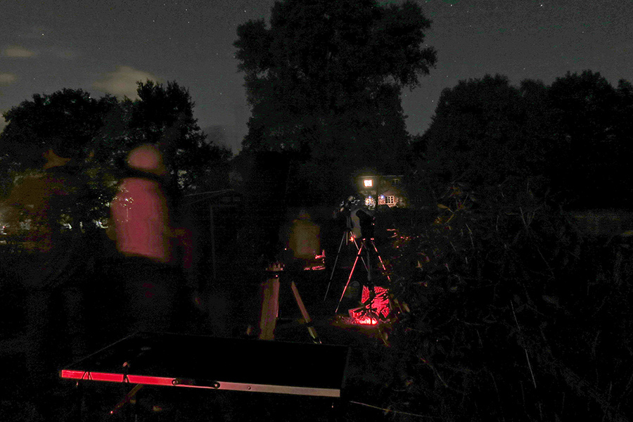 Die verschiedenen Teleskope waren zudem auch für die Vereinsmitglieder selbst spannend, da jede Optik bestimmte Himmelsobjekte anders darstellte. So konnte man bei Kai Wicker durch ein Newton-Teleskop verschiedene Kugelsternhaufen bewundern, während Ute Spiecker ihr Spektiv wieder dabei hatte, mit dem sich ausgiebige Mondspaziergänge geradezu anboten. Jürgen Adamczak war mit seinem Meade ETX-90 wieder mit dabei und auch die Rentzows hatten ihr portables Equipment mitgebracht. Ich selbst hatte mein Schmidt-Cassegrain-Teleskop C11 von Celestron mitgeschleppt, welches gerade frisch justiert und gereinigt vom Hersteller wieder zurück war. Ein Ausprobieren scheiterte aber im ersten Schritt daran, dass nach kurzer Anfahrt der Motoren eine Sicherung des Stromsteckers ausgefallen war. Normalerweise hätte man jetzt wieder einpacken können, aber es gibt bei der AVL auch sehr gut ausgerüstete Sternenfreunde. So konnte Kai Wicker helfen, da er für alle Gelegenheiten diverse Sicherungen mit dabei hatte.