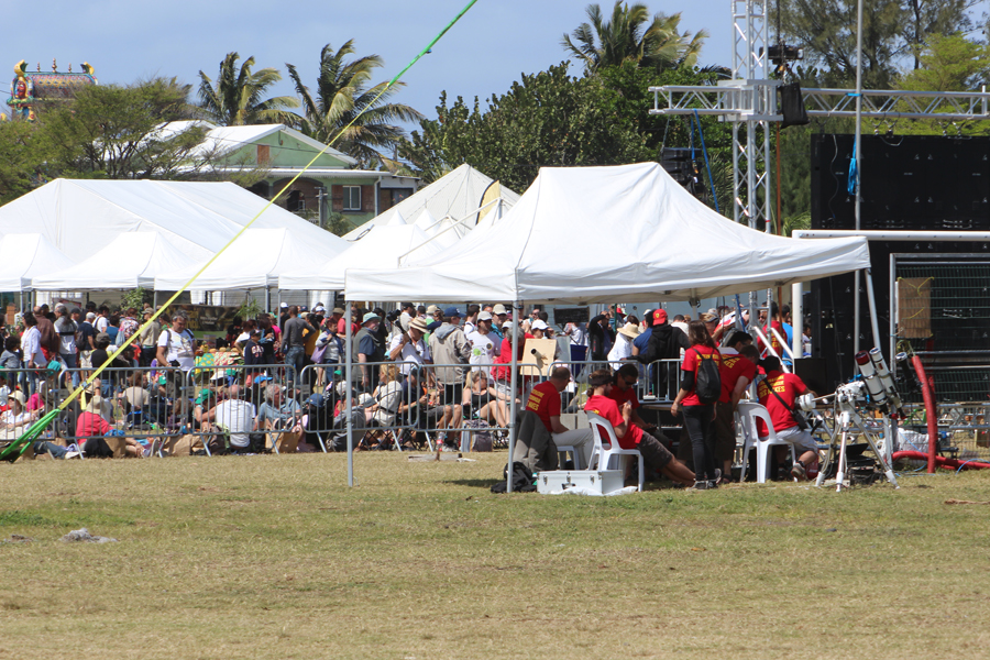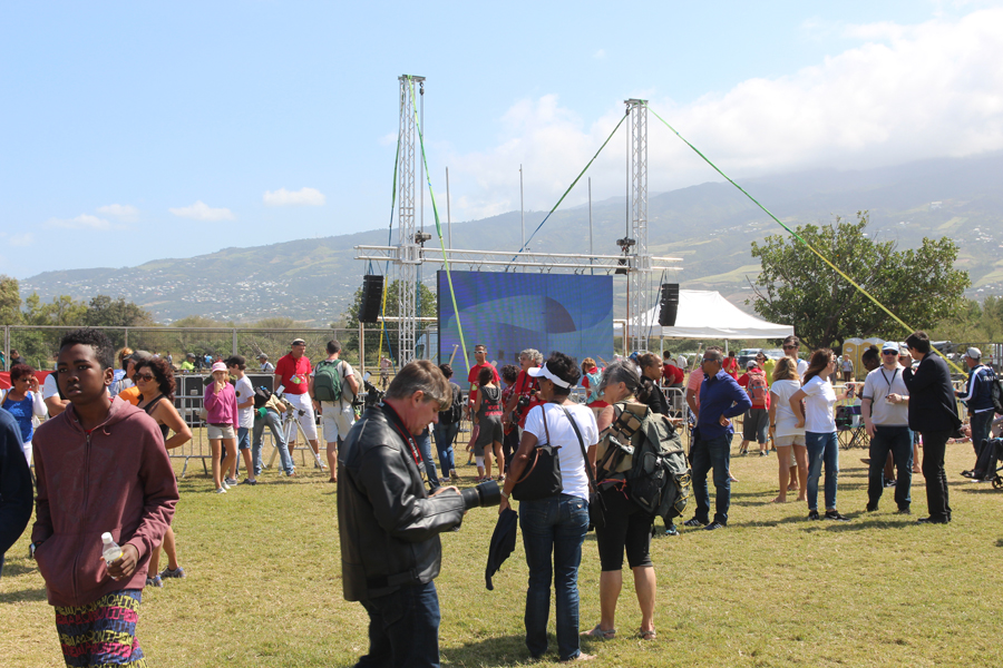 Laut Wettervorhersage sollte es in Saint-Denis am Tag der SoFi gutes Wetter mit starken Windböen geben. Wir hatten für das "Fußball-Stadion" gebucht und kamen mit unseren Karten auch direkt durch die polizeilichen Absperrungen. Der ortsansässige Astronomie-Verein hat alles bestens organisiert und diverse Geräte zur Beobachtung aufgebaut. Dort wurden die Teilnehmer beraten, konnten durch diverse Teleskope die Sonne sicher beobachten oder auf einer Großleinwand das Ereignis später kommentiert mitverfolgen. An die 250 Hobbyastronomen waren zusätzlich dem Aufruf wie wir gefolgt und machten sich bereits eine Stunde vor dem Beginn daran die mitgebachten Instrumente auszurichten sowie erste Kennlerngespräche durchzuführen. Sie wurden hinter dem Fußballfeld positioniert und waren durch eine Absperrung von den später erscheinenden Zuschauermassen geschützt. Das war auch nötig, da später an die 4.000 Zuschauer sich auf dem Feld tummelten und quasi keinen Platz mehr ließen