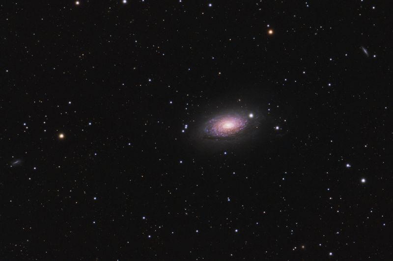 Die auch unter dem Namen Sonnenblumen-Galaxie bekannte Messier 63 hat einen hellen, gelblichen Kern und weitläufige Spiralarme, die von kosmischen Staubbahnen durchzogen und von rosafarbenen Sternbildungsregionen gesprenkelt sind. In der 1.000 Lichtjahre messenden Zentralregion von Messier 63 befindet sich ein aktiver Kern. Die Messungen der Rotationsgeschwindigkeit in dieser Region lassen auf ein zentrales Schwarzes Loch schließen, das etwa eine Milliarde Sonnenmassen besitzt.