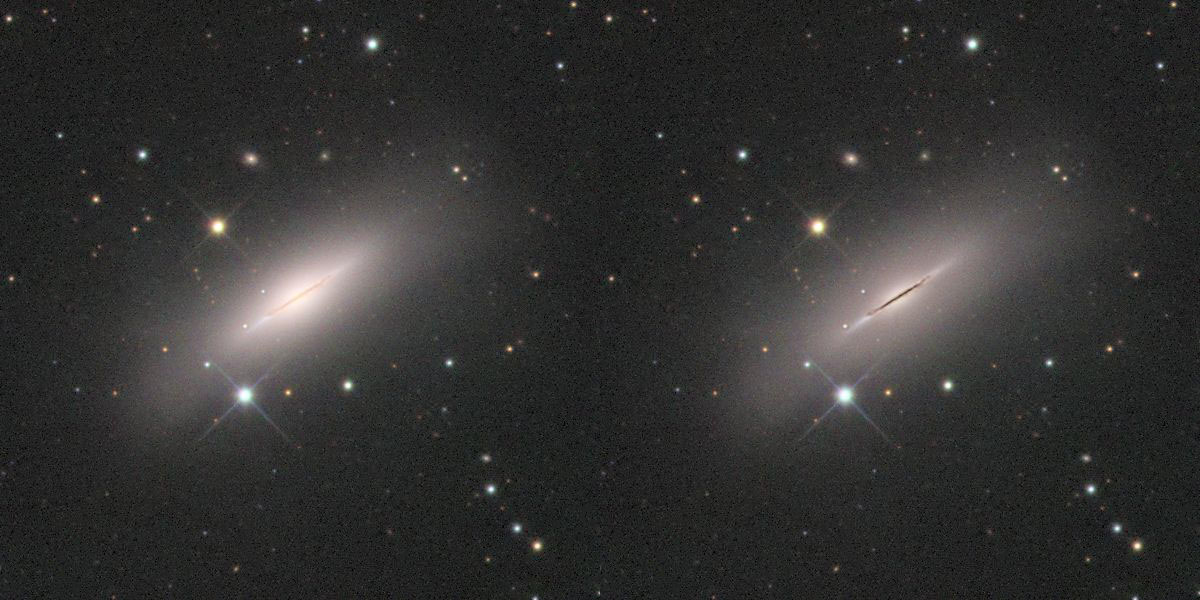 Die Bearbeitung der Bilddaten erfolgte in Pixinsight. Bei Aufnahmen dieser Galaxie besteht die Gefahr, dass die hellen Anteile das dunkle Staubband überstrahlen. Dieses ist deswegen auf langbelichteten Aufnahmen schwer erkennbar. Diesem Sachverhalt wurde bei der Bildbearbeitung versucht gerecht zu werden, indem eine Dynamikkompression für ausgewählte Bildanteile durchgeführt wurde (HDRMT). Die Herausforderung bestand hier darin nicht zu übertreiben, da das Ergebnis sonst schnell unnatürlich wirkt. Siehe hierzu das Zusatzbild. Es zeigt die Galaxie ganz ohne Dynamikkompression und mit – aus der Sicht des Autors – übertriebener Kompression. Unsicher ist sich der Autor über die leicht rosa erscheinende Farbwirkung der Galaxie. Diese ergibt sich trotz – hoffentlich korrekter – astrometrischer Farbkalibration.