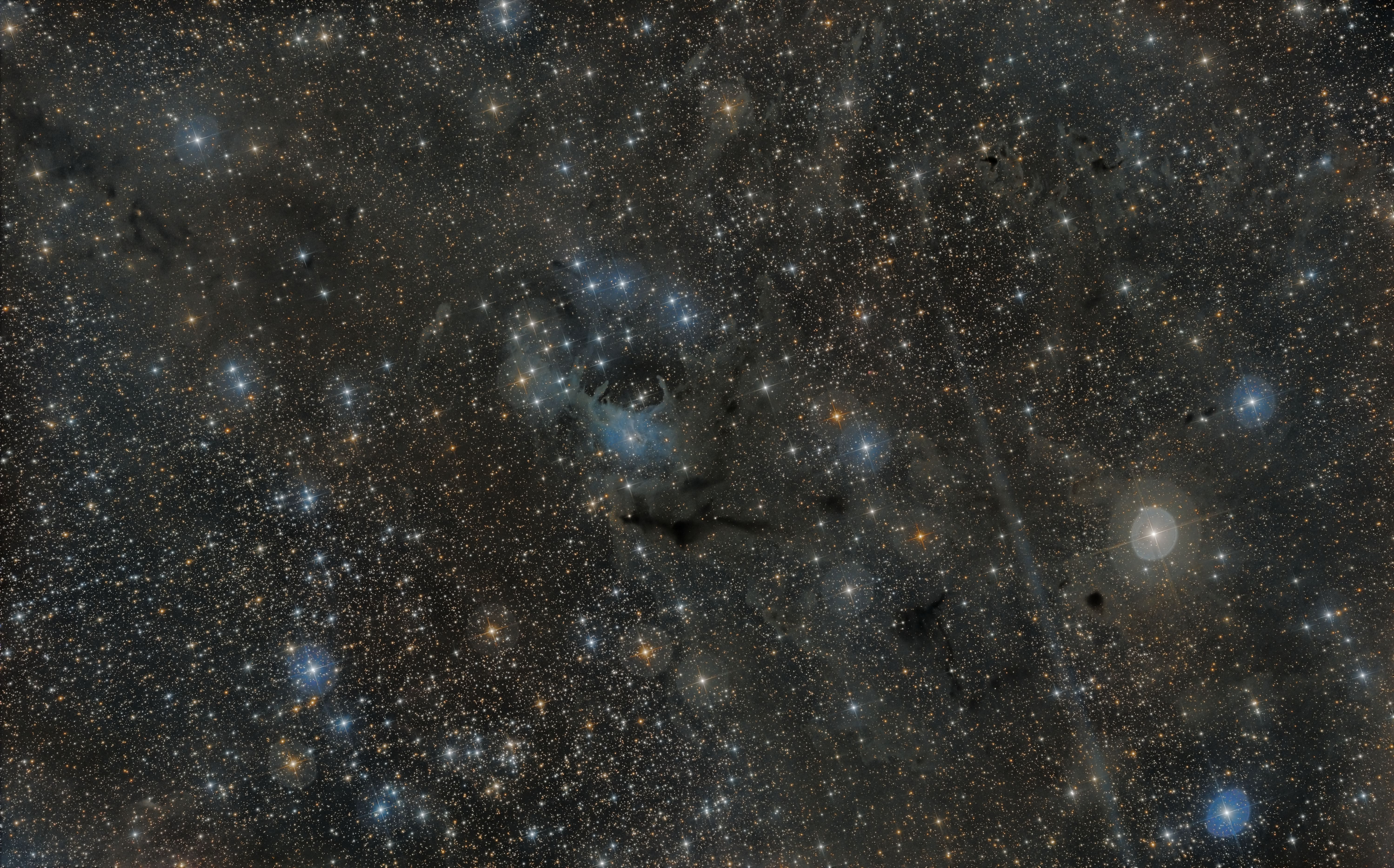 Damit die eher schwachen Reflexions- und Dunkelnebel abgebildet werden, mussten einige Maßnahmen ergriffen werden. Zum einen wurde ein Teleskop mit einem Öffnungsverhältnis von effektiv etwa f/D ≈ 3 eingesetzt. Zum anderen wurde trotz des recht „lichtstarken Teleskops insgesamt 28.5 h belichtet. Zusätzlich wurden die Luminanzanteile zu großen Teilen in zwei Nächten im Breddorfer Moor gesammelt, wo die Bremer Lichtverschmutzung nicht mehr so deutlich auffällt. Insgesamt wurden für die hier vorliegende LRGB-Aufnahme über fünf Nächte zwischen August und Oktober 2024 belichtet. Verwendet wurde ein 10“ Selbstbaunewton und eine QHY268M mit Baader LRGB Filtern. Die Bildbearbeitung erfolgte mit Pixinsight.